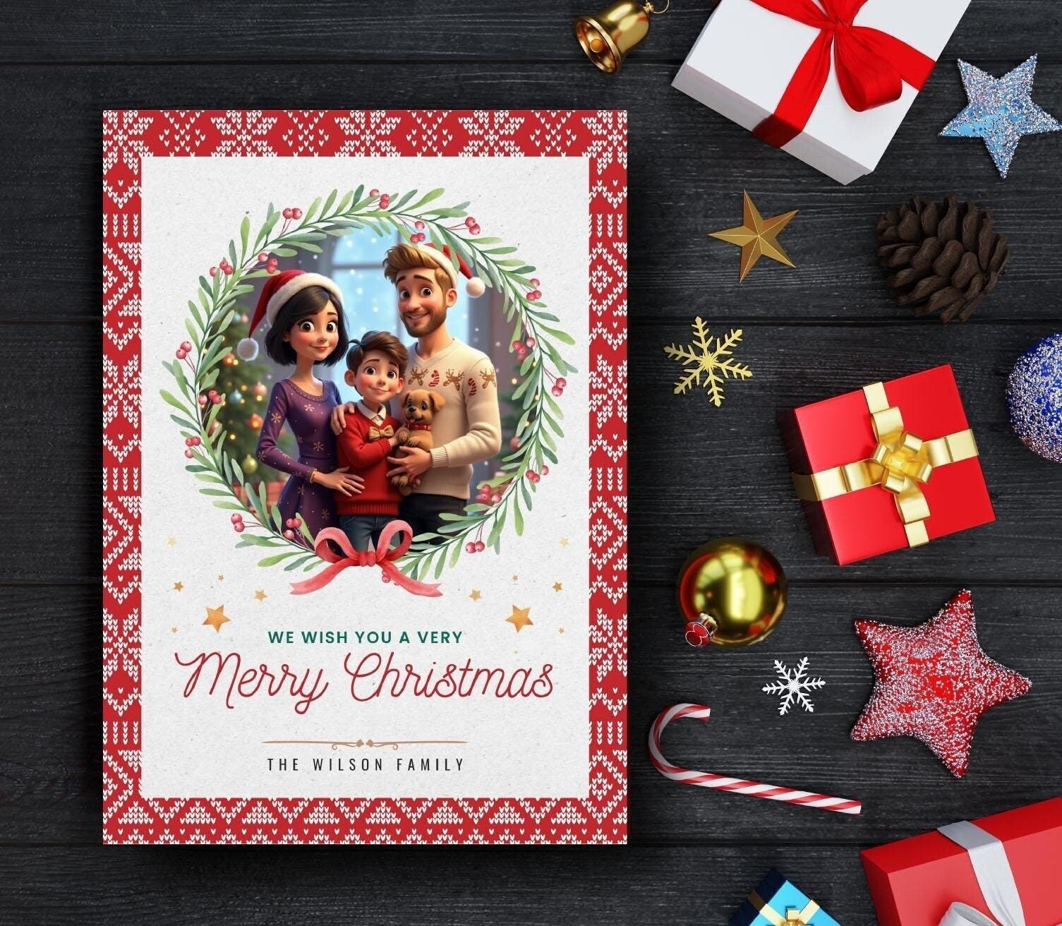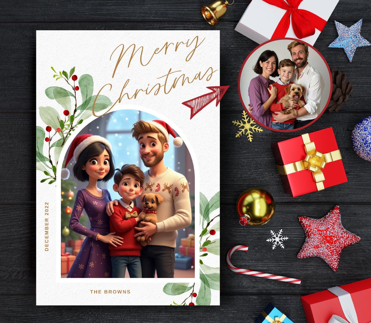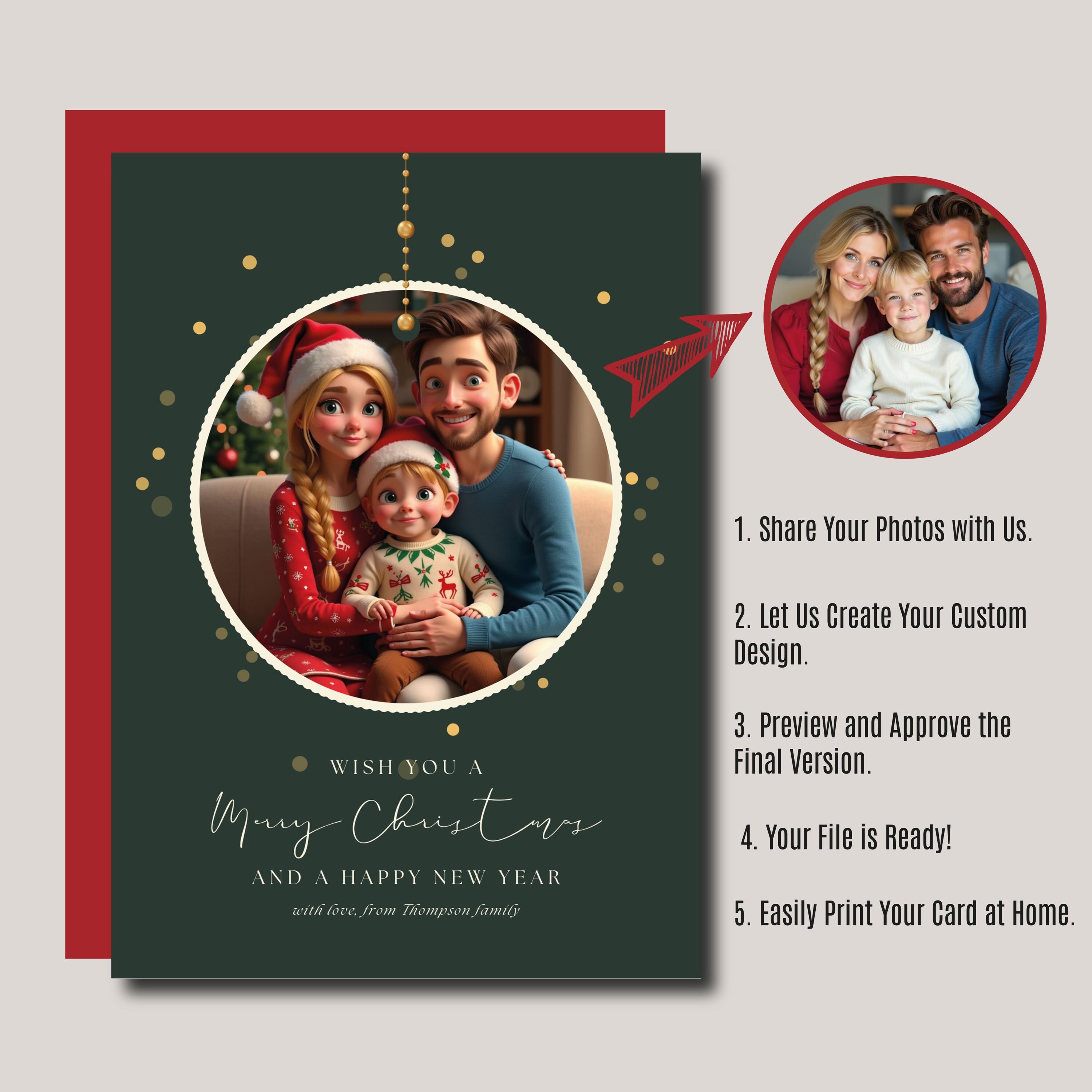 Bring extra joy to your holiday season with a personalized cartoon Christmas card! This one-of-a-kind card features a custom illustration of your family and pets, designed to capture the festive spirit in a fun and memorable way. A perfect greeting to make your loved ones smile!