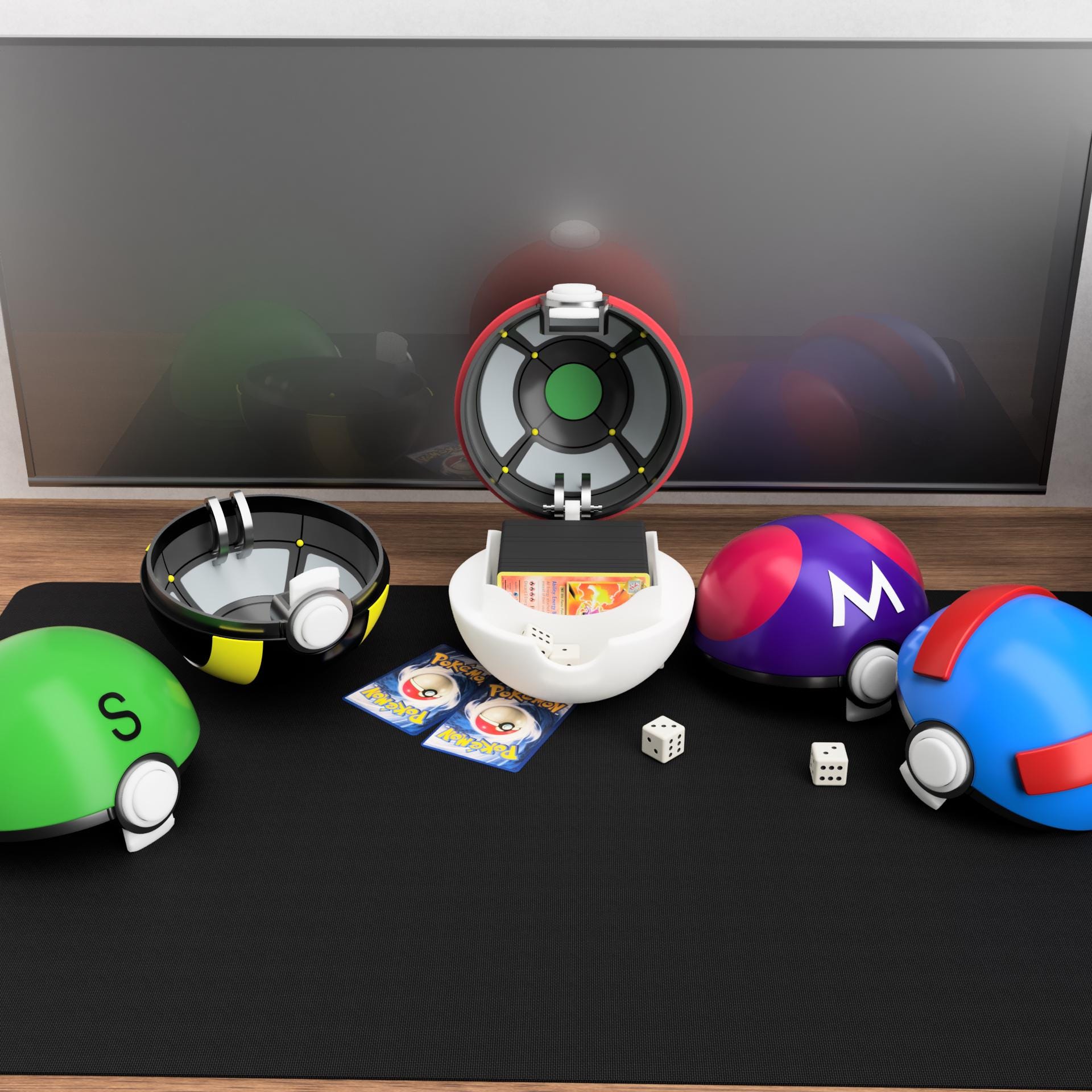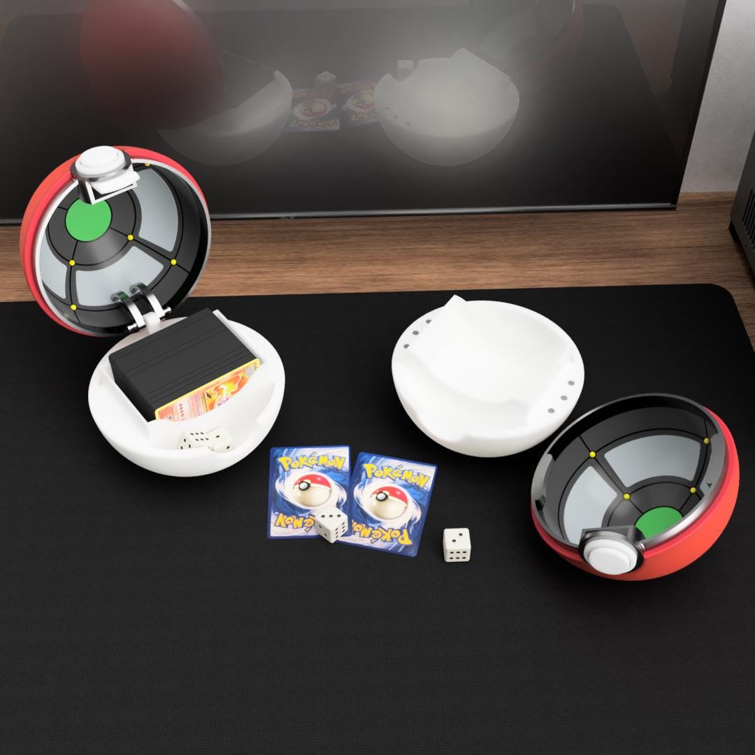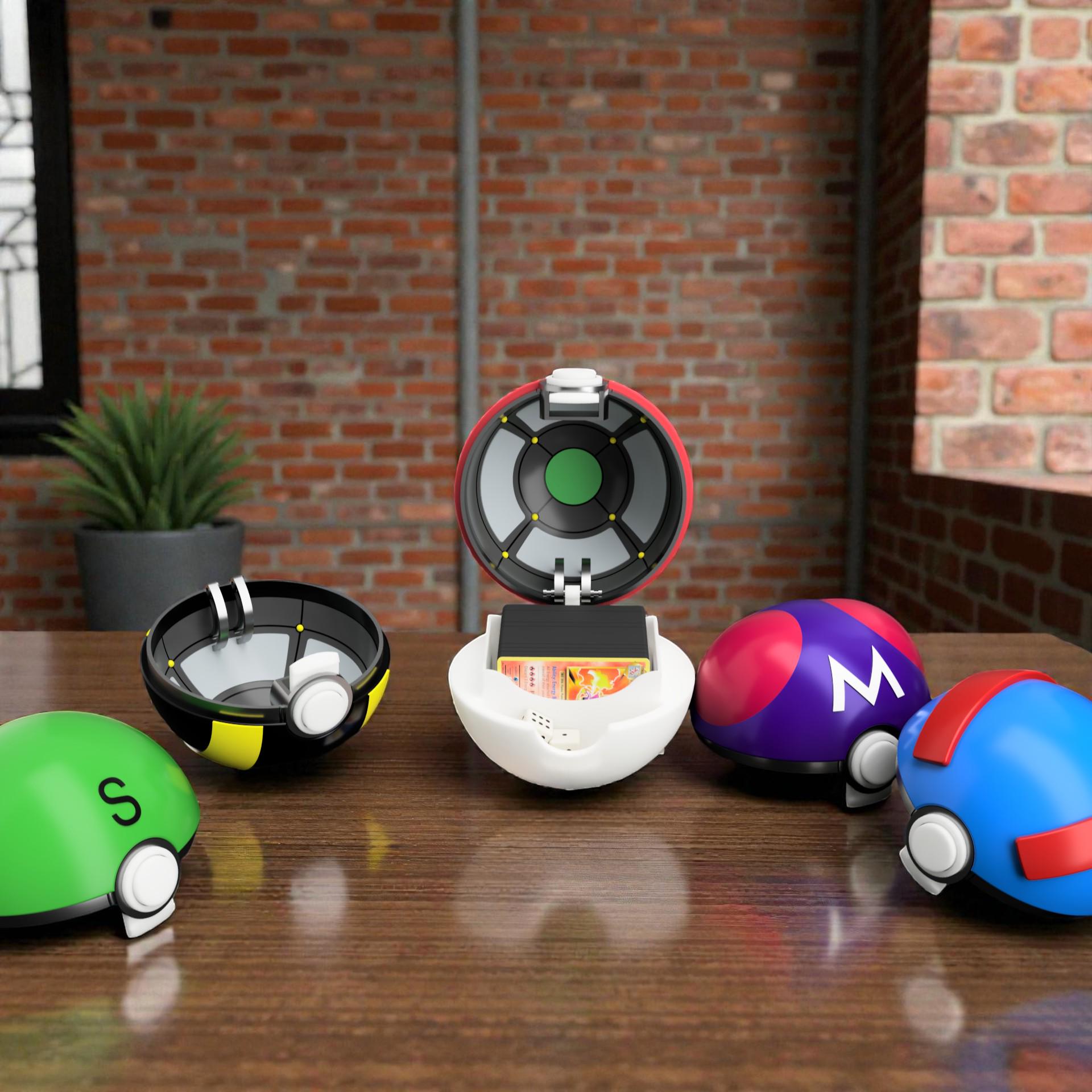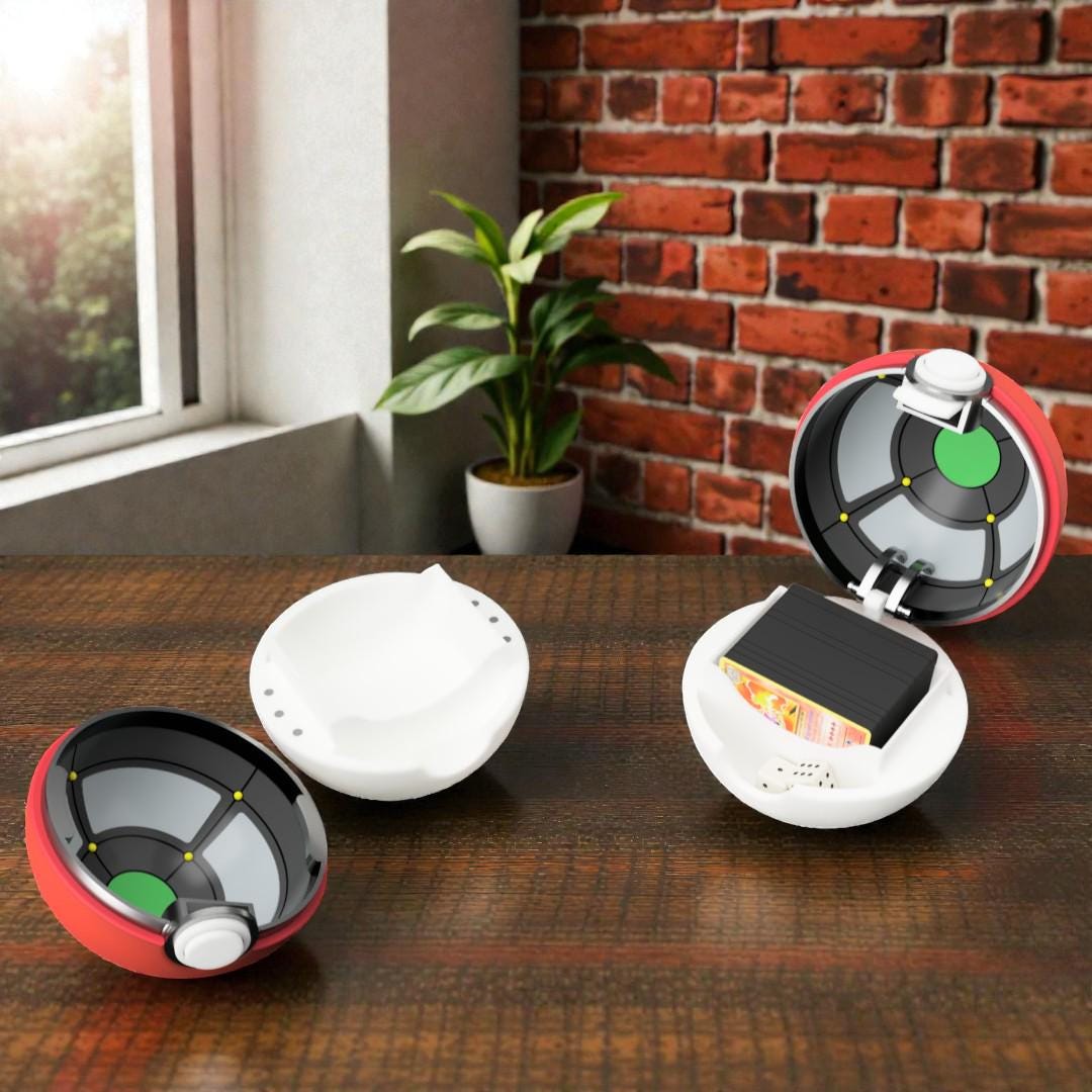 This interactive deck box is inspired by the famous creature capture spheres known by monster-battle fans. The design features a working push-button mechanism that pops the box open when pressed, creating a fun and satisfying way to access your cards.